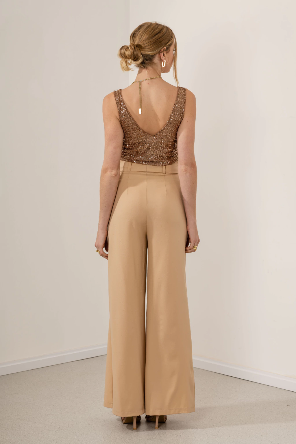 Pantalón palazzo de crepe con pinzas y lazo, una prenda que ha perdurado por más de una década y sigue siendo un éxito como el primer día. Este pantalón ofrece el calce perfecto y la caída ideal gracias a su confección en crepe liviano, asegurando comodidad y estilo.