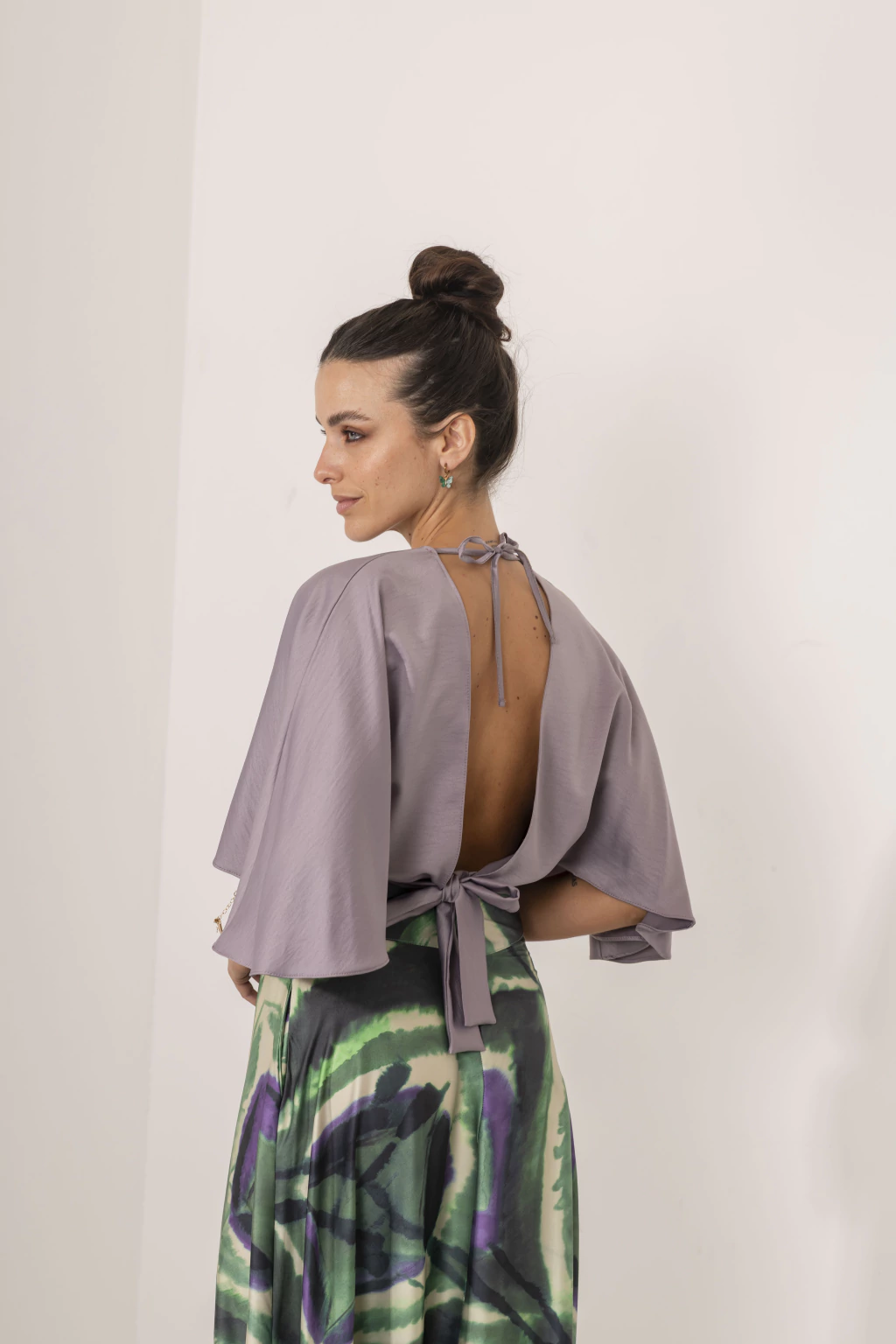 Nuestra blusa murciélago lisa es perfecta para cualquier ocasión. Confeccionada en seda lisa, este modelo se adapta a la cintura gracias a sus dos lazos en la espalda. Ideal para combinar con prendas de tiro alto, es un comodín que te vestirá bien siempre.