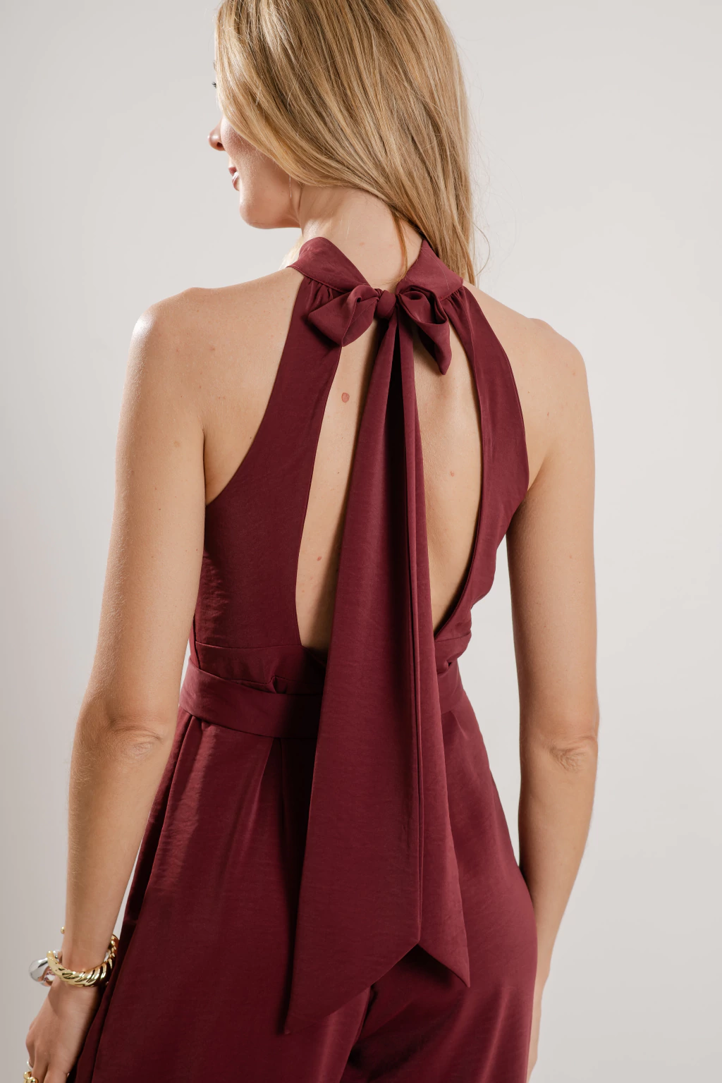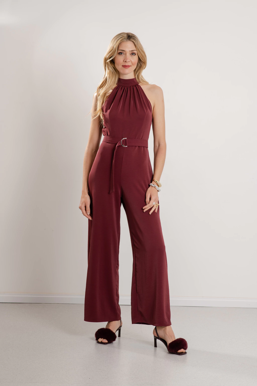 Un diseño que es un fuego. Este mono largo de seda pesada opaca ofrece un estilo sofisticado con su cuello americano y pata ancha. Perfecta caída y calce. Su espalda baja y cintura ancha, realzadas por un super lazo, te enamorarán. Cierre trasero para un ajuste impecable.