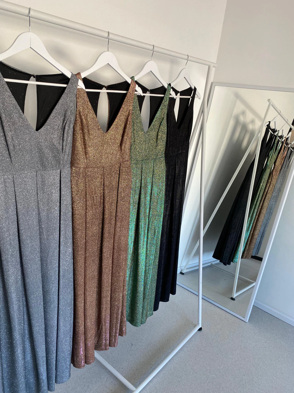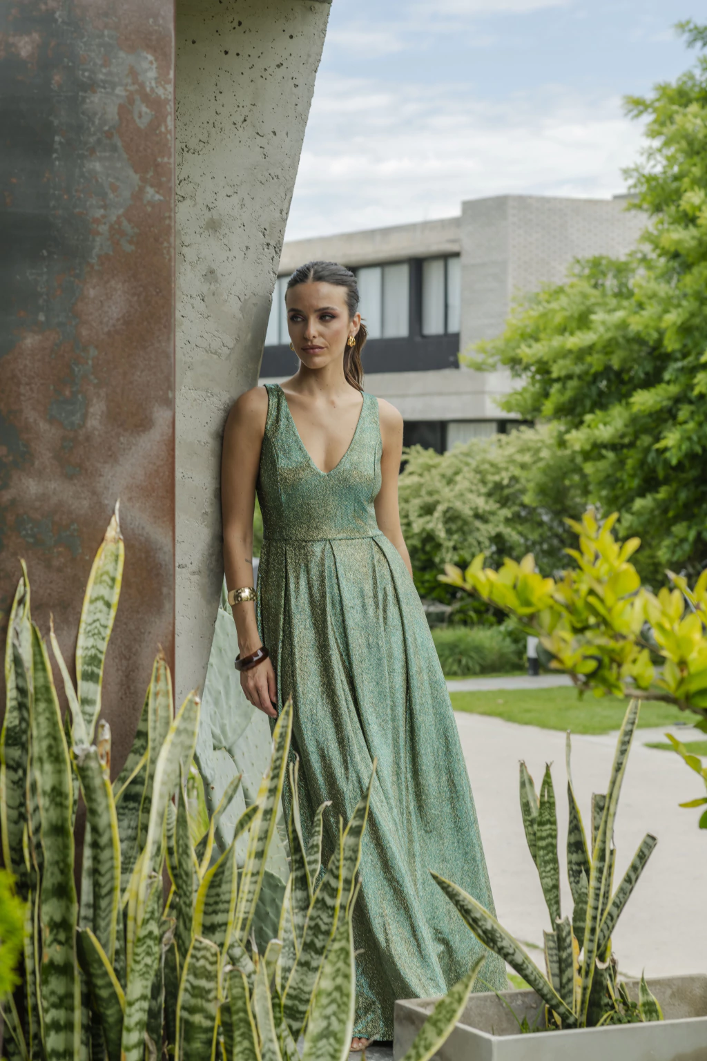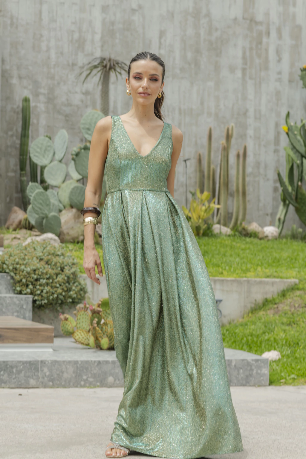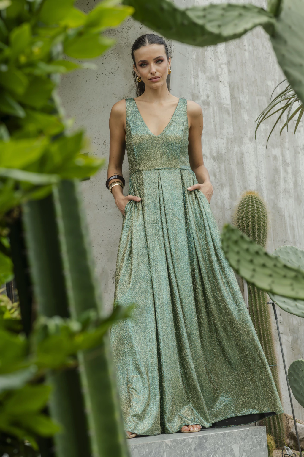 Este vestido largo deslumbra con su glitter y diseño elegante. La parte superior se ajusta al cuerpo, destacando una espalda con súper gota y botón dorado. Su maxi falda con tablas y bolsillos brinda movimiento y practicidad. Con cierre y tela elastizada, es súper cómodo y adaptable a cada silueta. Ideal para ocasiones especiales.
